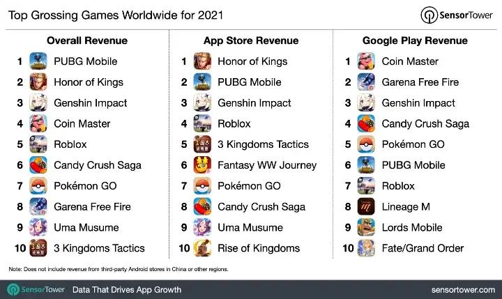 The goldmine that is mobile gaming is build largely on the “Free-to-Play” model, which commonly translates into “Pay-to-Win”. “Free-to-Play” games make their money by hooking players into the game early and extracting value over time with in-app purchases for digital resources or leveraging season type subscriptions for faster progression. If you look at the top grossing mobile games from 2021 across both the Apple App Store and Google Play they are all “Free-to-Play”.