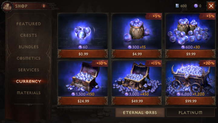 - Platinum (purchased with Eternal Orbs, which are purchased with $)